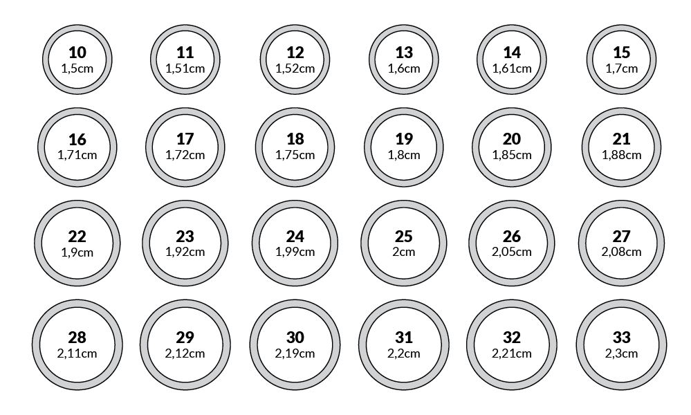 Com o valor da medida em mãos, agora confira em nossa tabela o tamanho do aro de seu Anel.