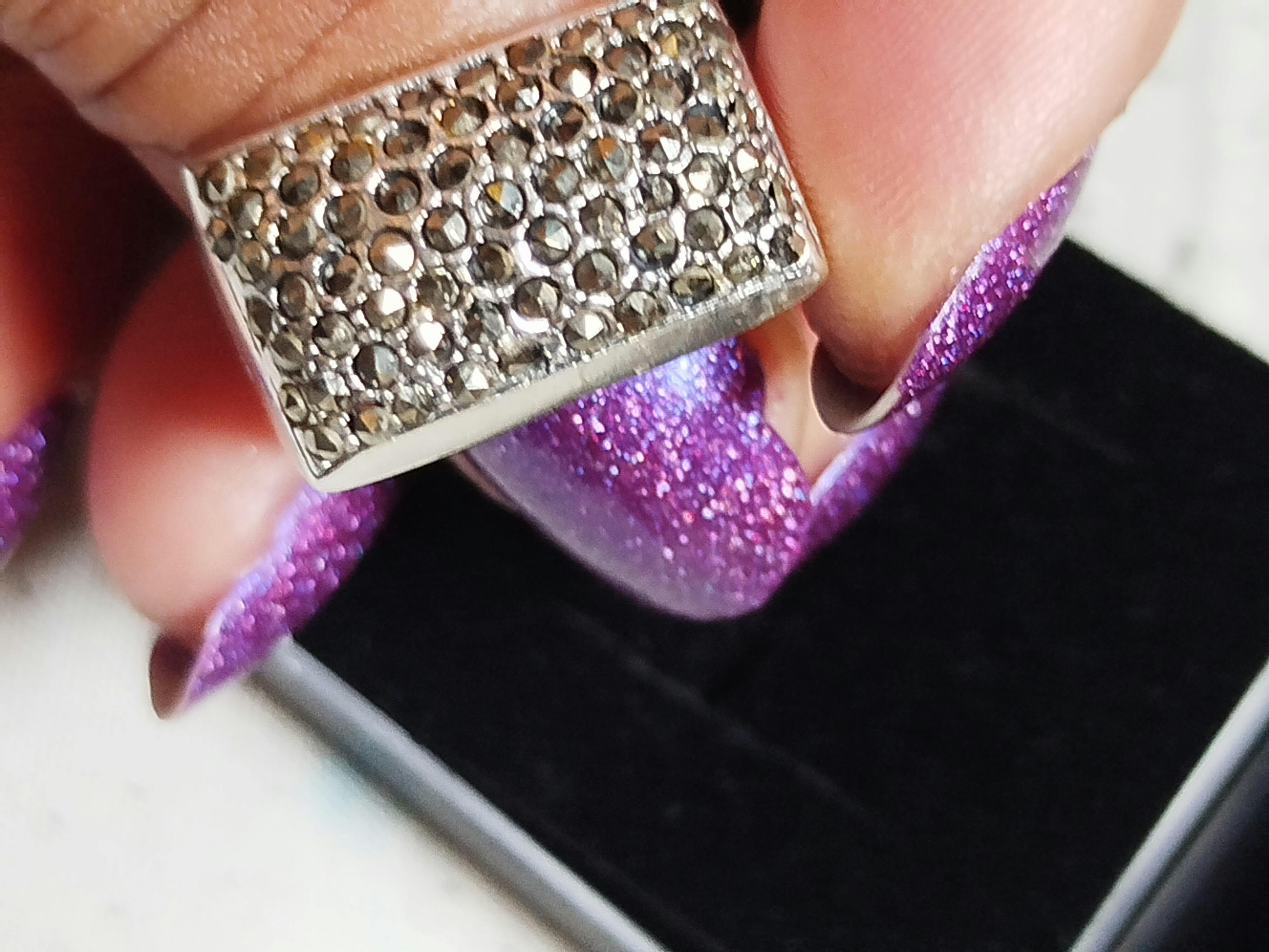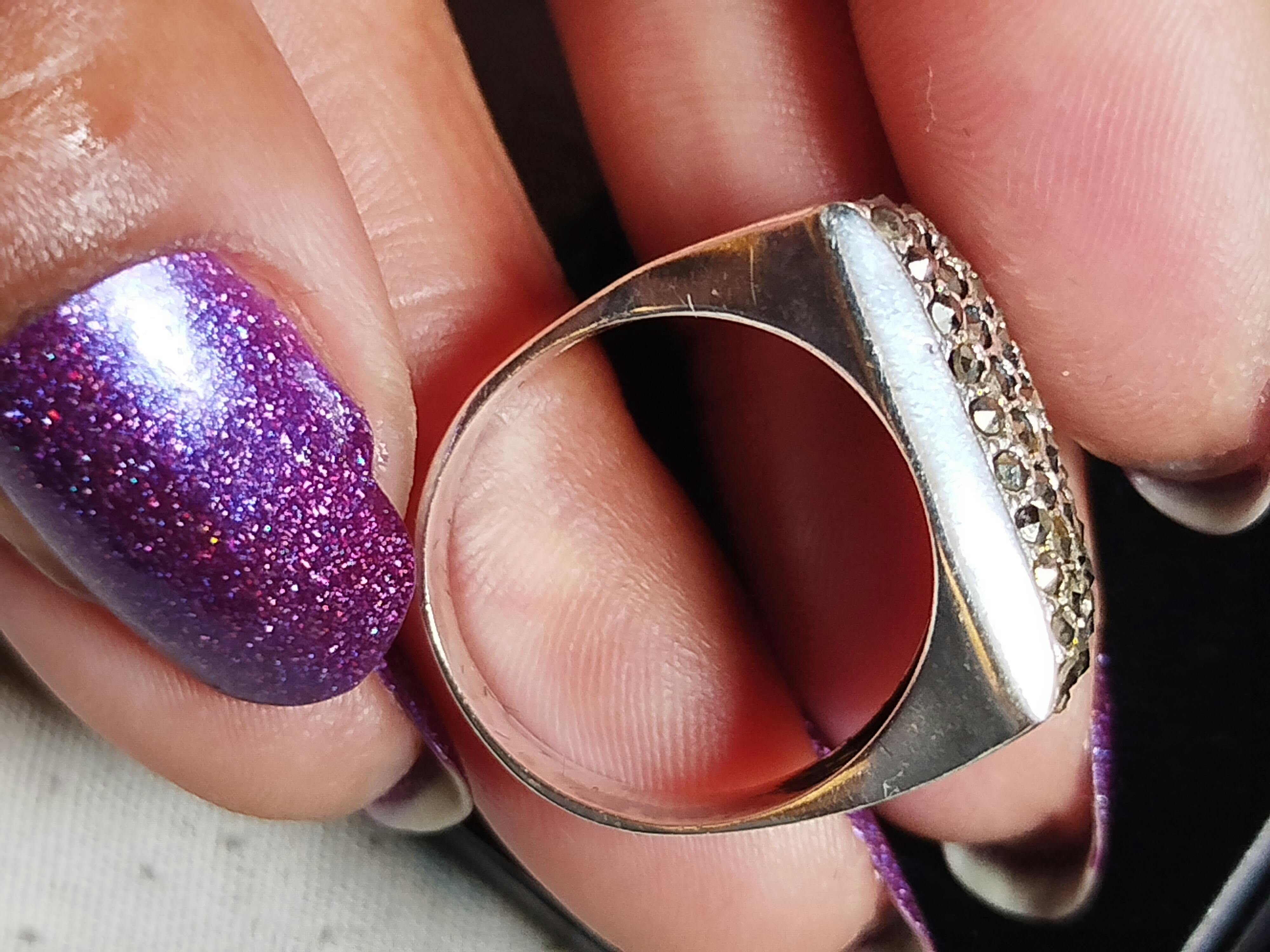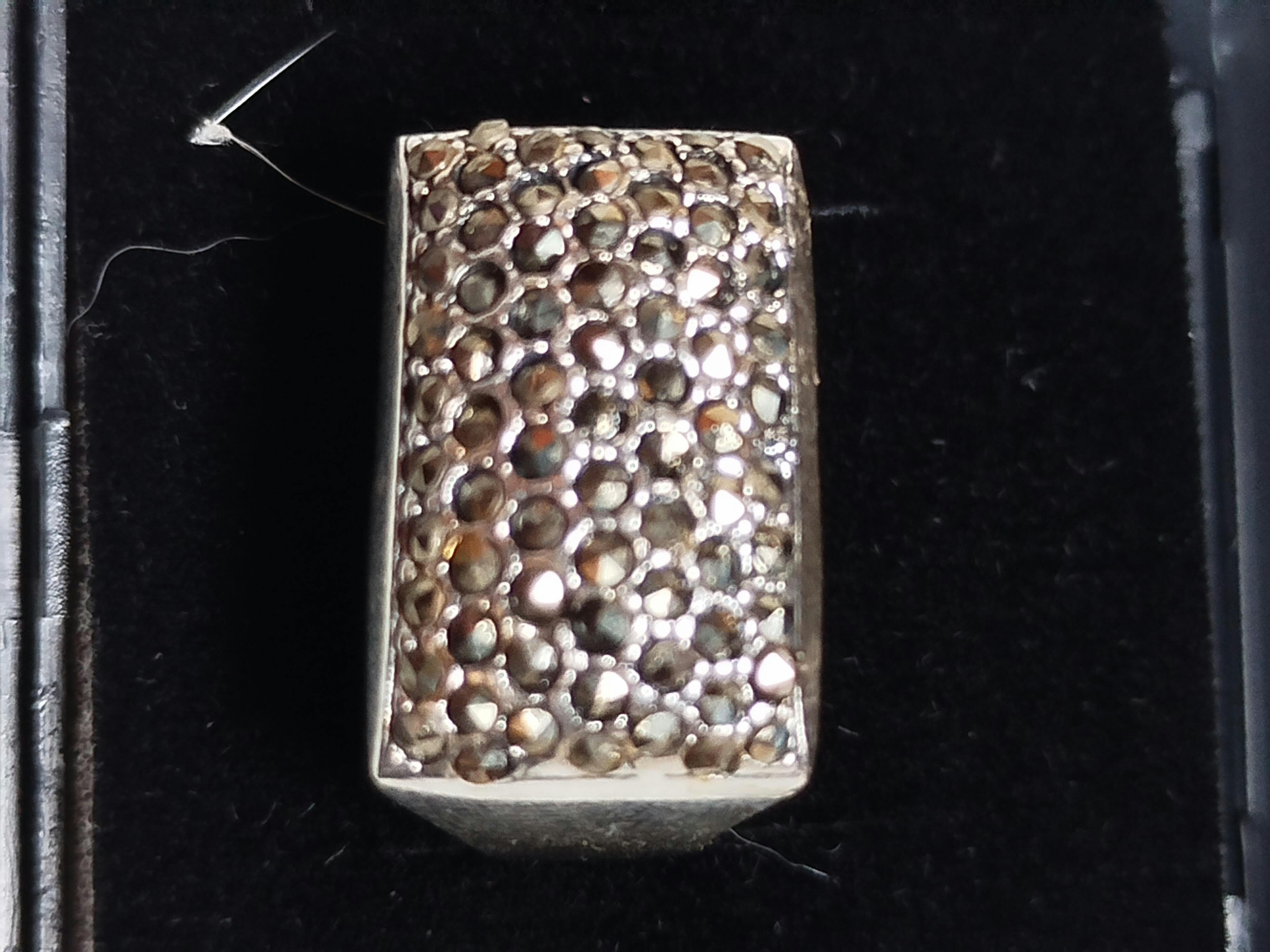 Joia com detalhes em pedras, possui aproximadamente 30 pedras de Marcassita. Anel envelhecido no formato retangular.
