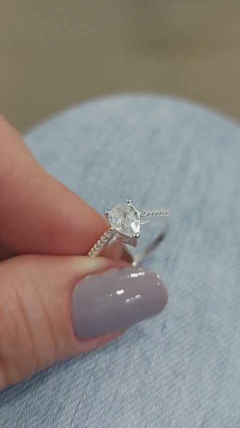 Joia em prata com 1 pedra central de Zircônia transparente no formato de gota e 14 pedras nas laterais.