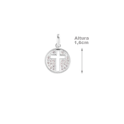 Joia em formato redondo com uma cruz vazada. Possui aproximadamente 24 pedras de zircônias.